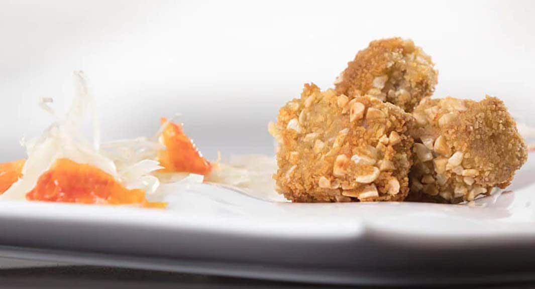 1. Prepare the breading by placing the chunks in the flour, then the eggs, and lastly in the breadcrumbs with almond nibs.