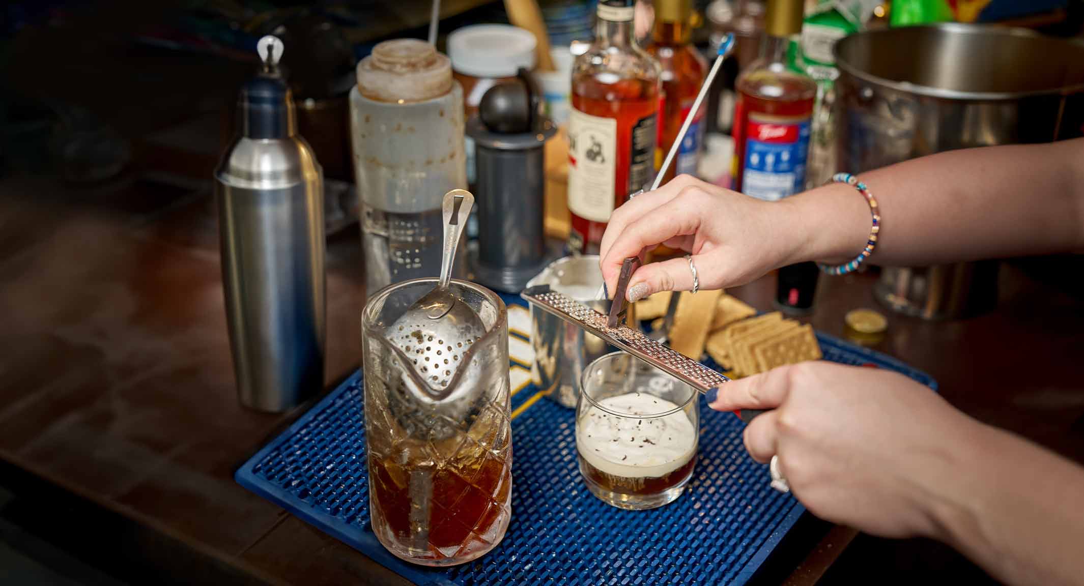 Paso 1: Toma un vaso de whisky, cubre los laterales con sirope de malvaviscos hasta la mitad y muele las galletas Graham.